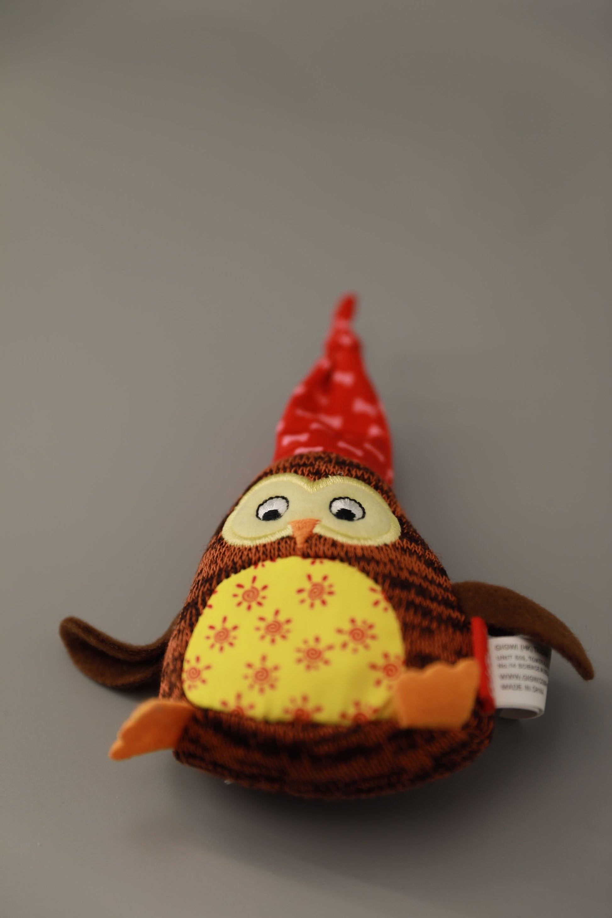 - Textured Body: The owl's body is made from a rich brown and black knitted or mottled fabric that provides an appealing surface for your dog to nuzzle and carry.